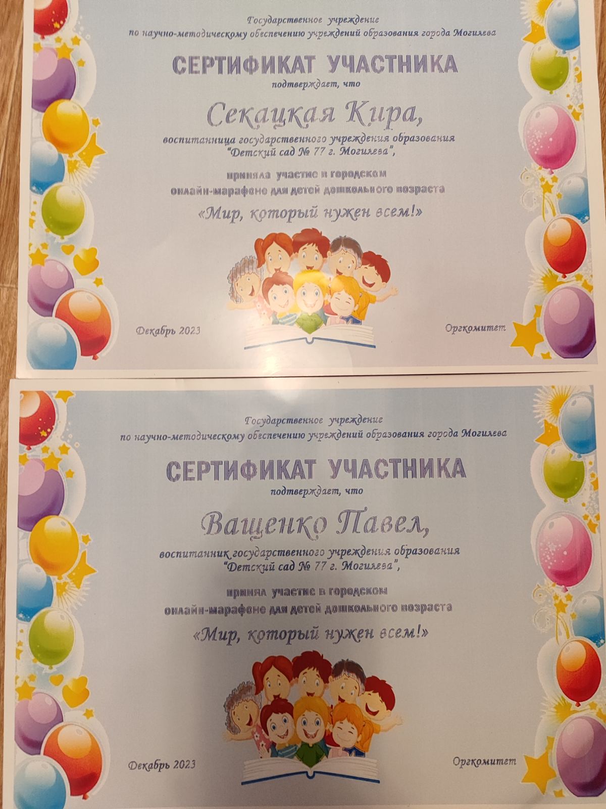 Секацкая Кира и Ващенко Павел приняли участие в онлайн- марафоне для детей дошкольного возраста "Мир. который нужен всем!".