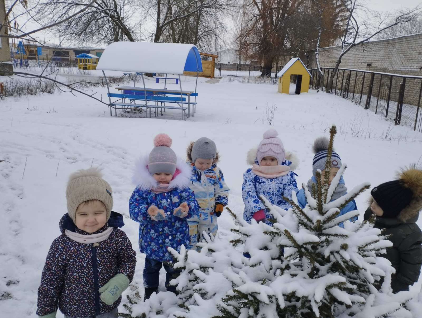 Дети 1 младшей группы вместе с воспитателем Сергейченко С. А.ходили в гости к ёлочке. Увидели красоту ёлочки в зимний период: зелёная ёлочка на фоне белого снега. Проявляли бережное отношение к ней - укрывали снегом, слушали стихотворение. У ребят появилось желание беречь природу.