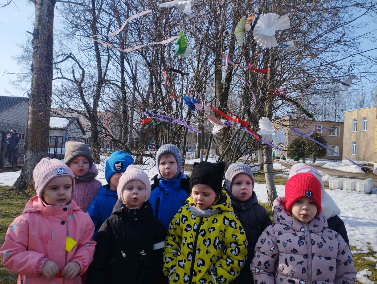 Лiчылася, што менавiта птушкi прыносяць вясну на сваiх крылах.Таму выхавацель Сяргейчанка С. А. разам з дзецьмi сваей группы зрабiлi птушак з паперы i упрыгожылi дрэвы папяровымi птушкамi i стужкамi. Дзецям было вельмi цiкава. Паутаралi заклiчкi разам з дарослымi , Каб паскорыць приход цяпла.Свята прайшло весела.