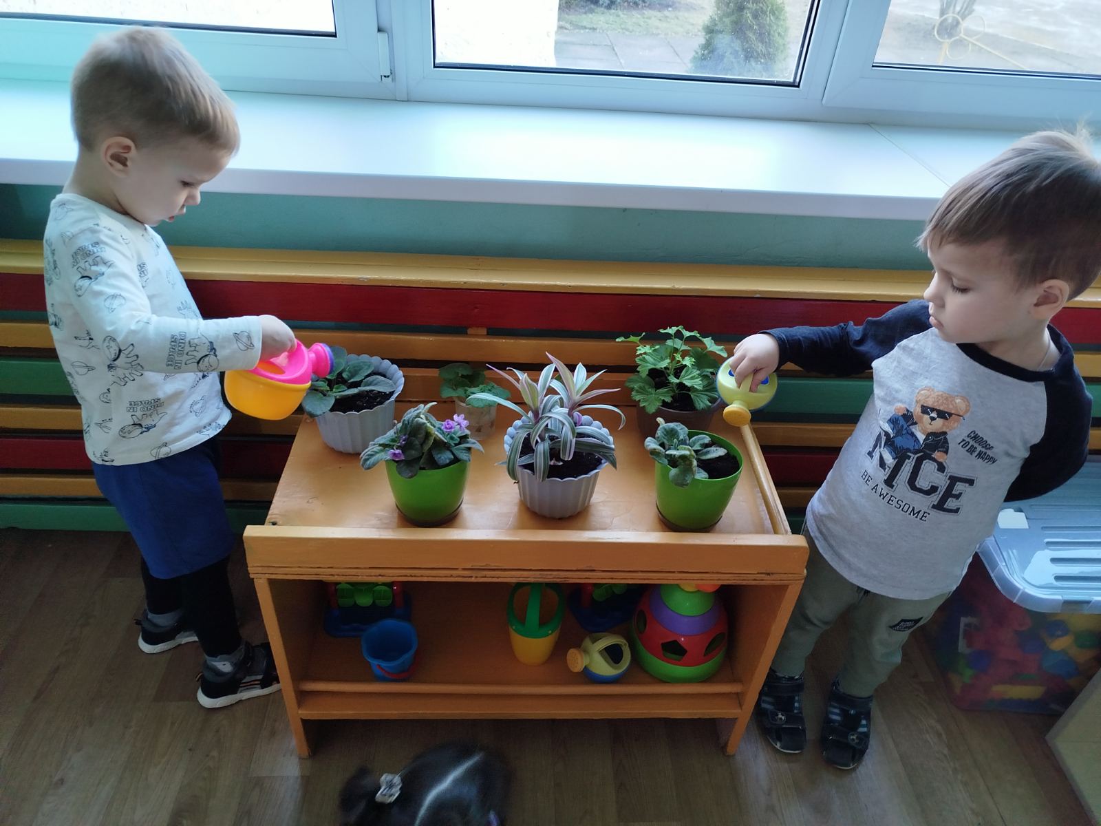 Воспитатель Баглик С.И. организовала с детьми первой младшей группы хозяйственно-бытовую игру "Уход за комнатными растениями".